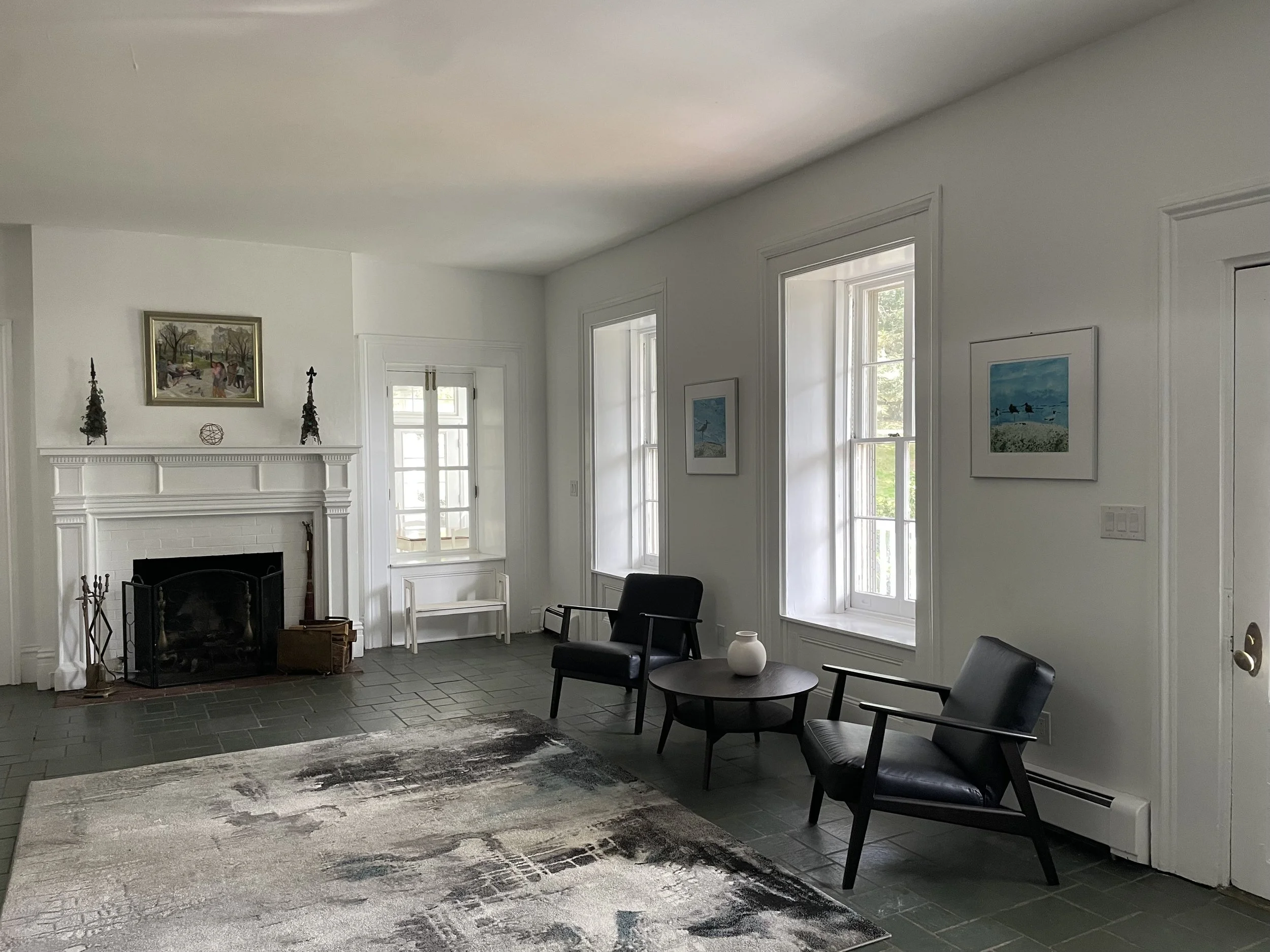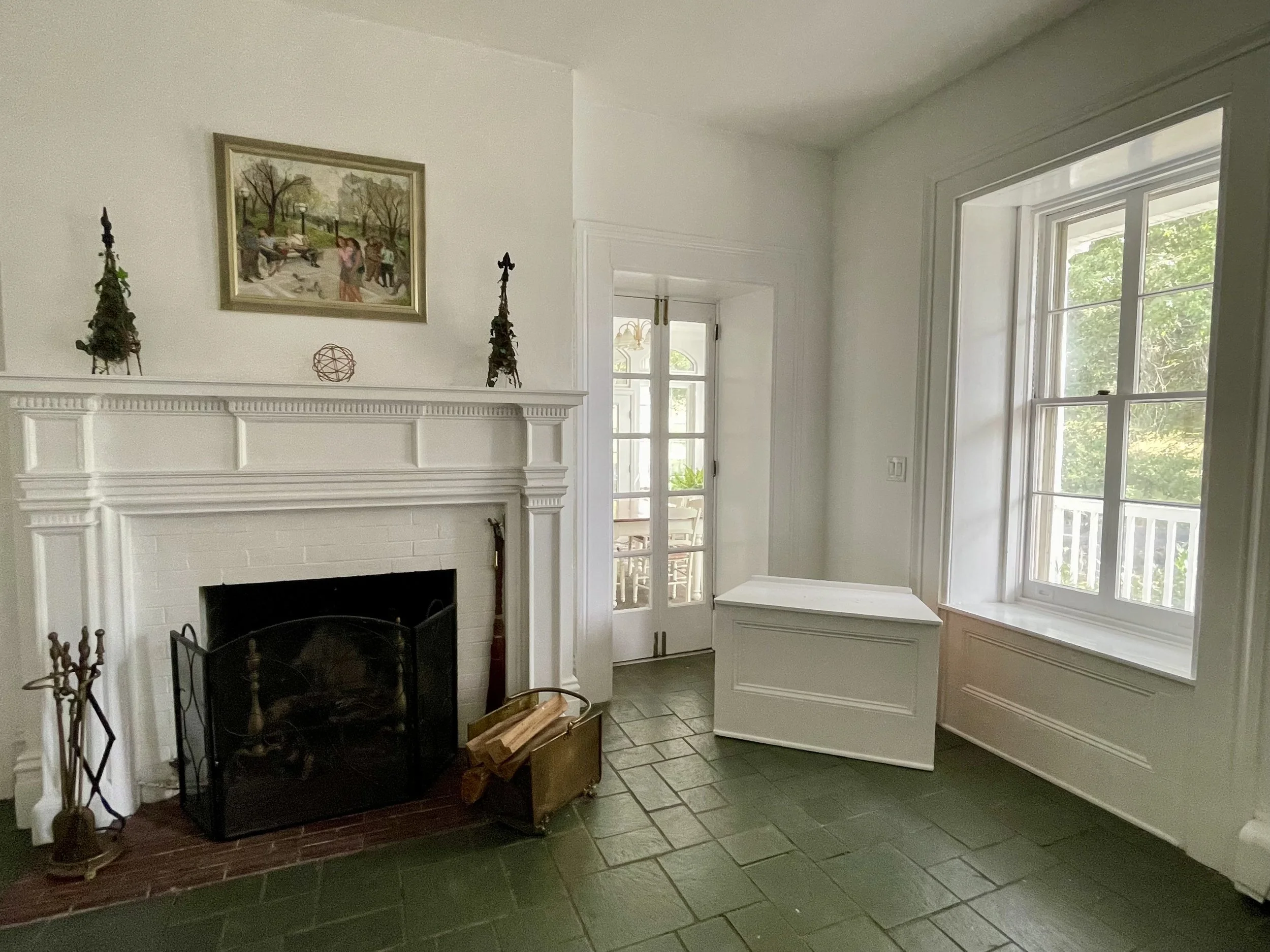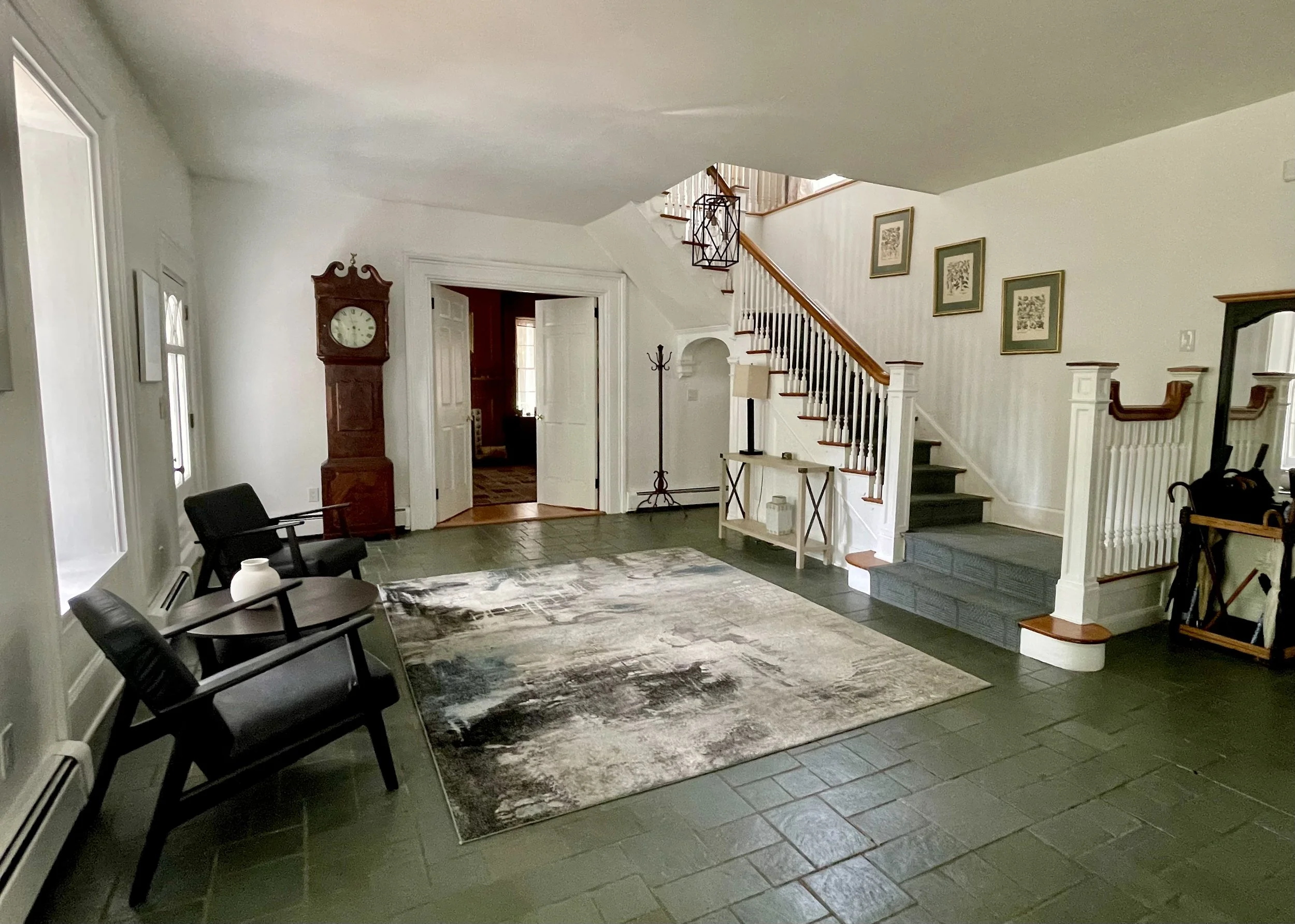 The entrance hallway, contains a working fireplace at one end, a wide staircase with two landings leading to the second floor, and a blue-gray slate floor. It is centrally located with doors opening to the front porch, the den, the Victorian porch, the kitchen, the living room, and the sun room.
