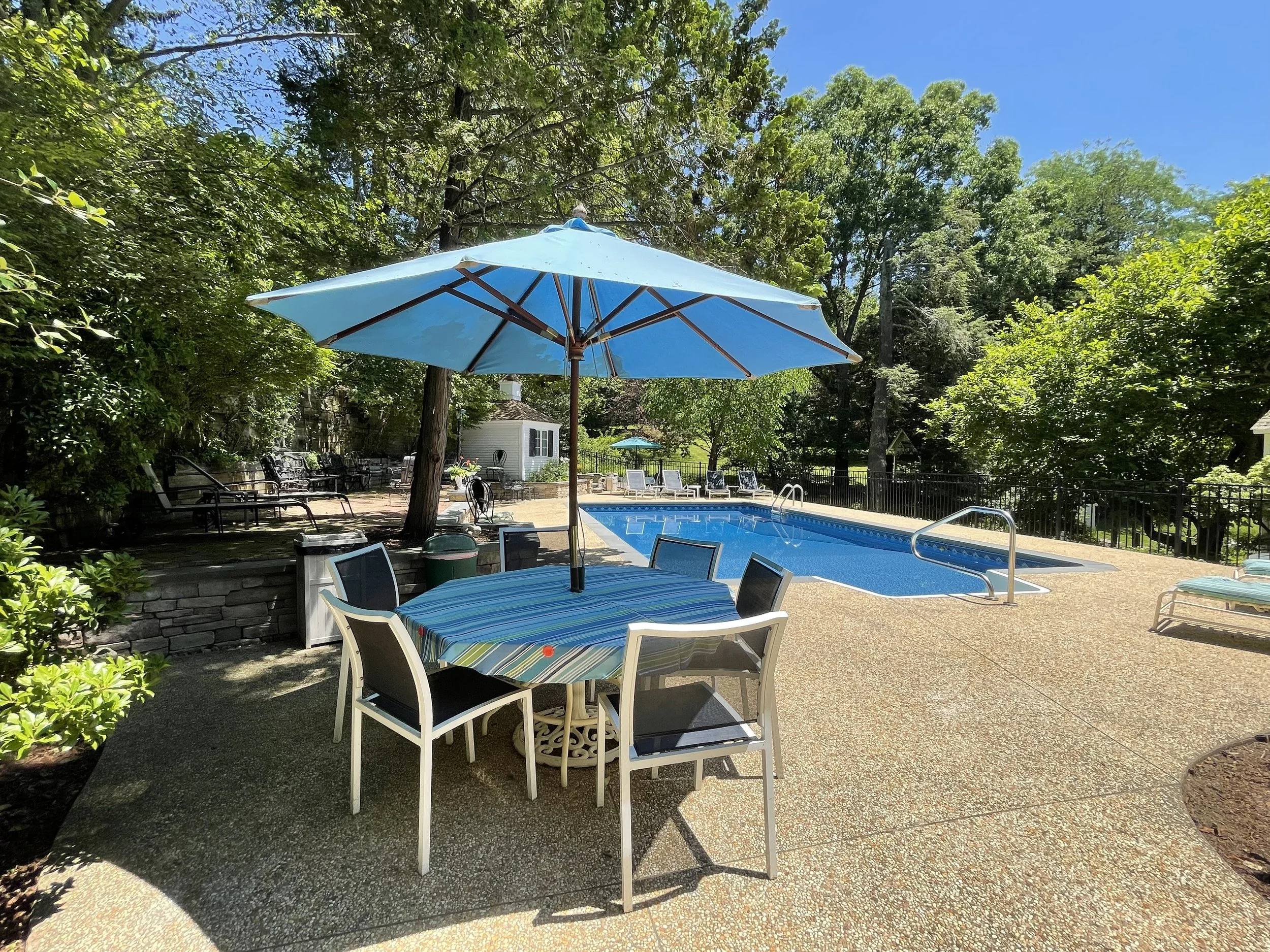 On the north side is a raised brick terrace furnished with chairs and tables. This terrace has a 15’ high backdrop of railroad ties and shrubs along one side. On the northwest end of the pool is a small white pool house.