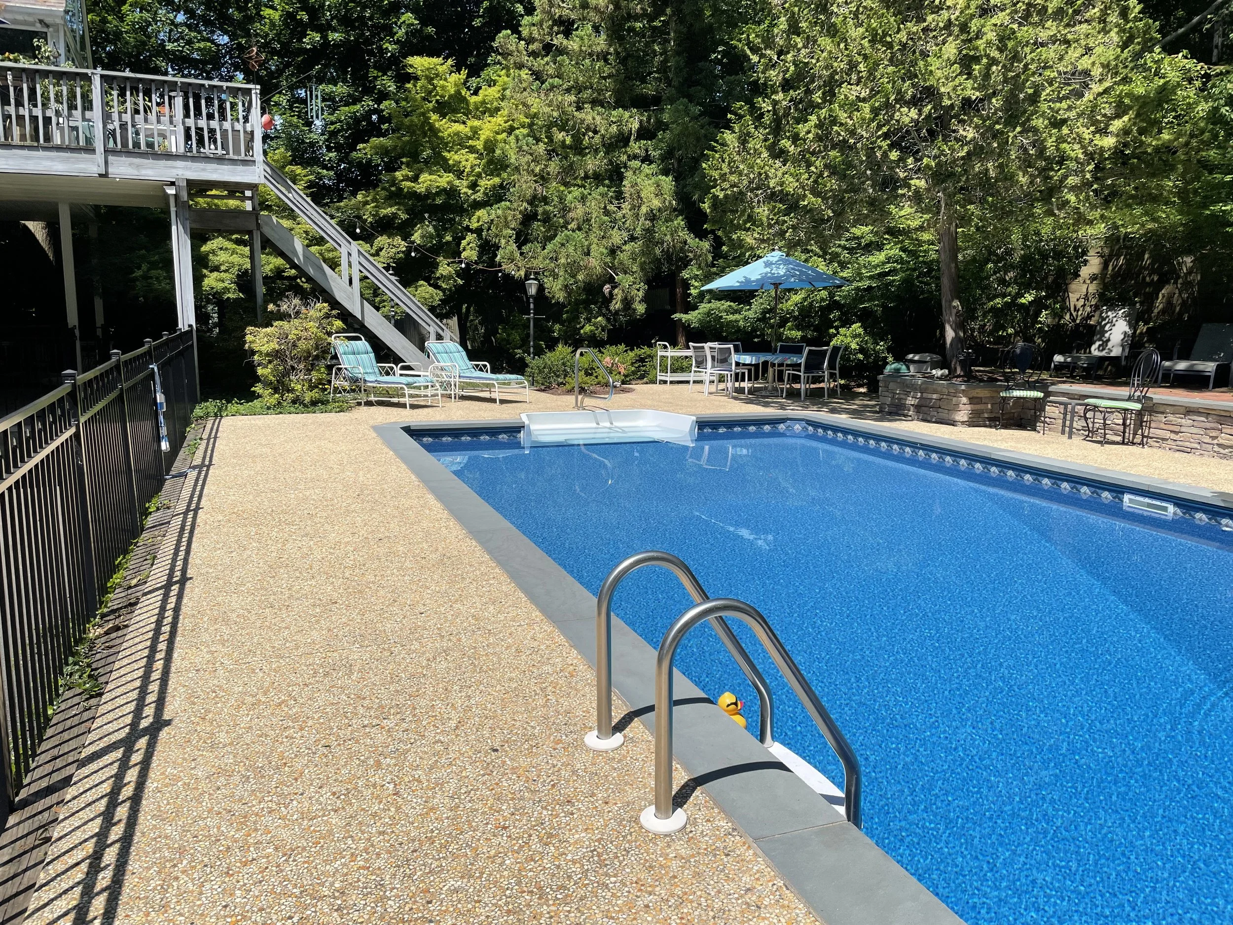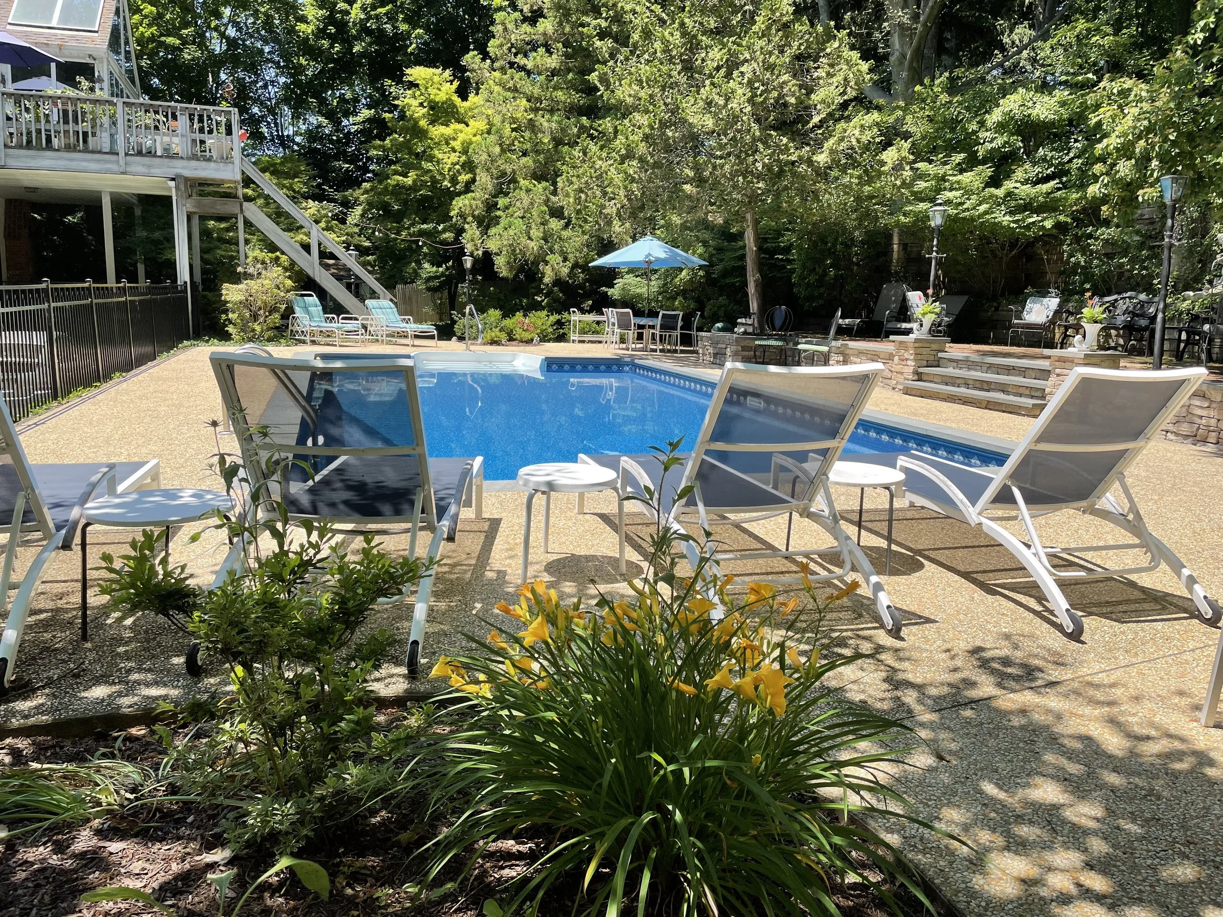 Completely renovated in 2016, the in-ground pool has a blue and white mosaic design with a bluestone coping. The decking is exposed aggregate.