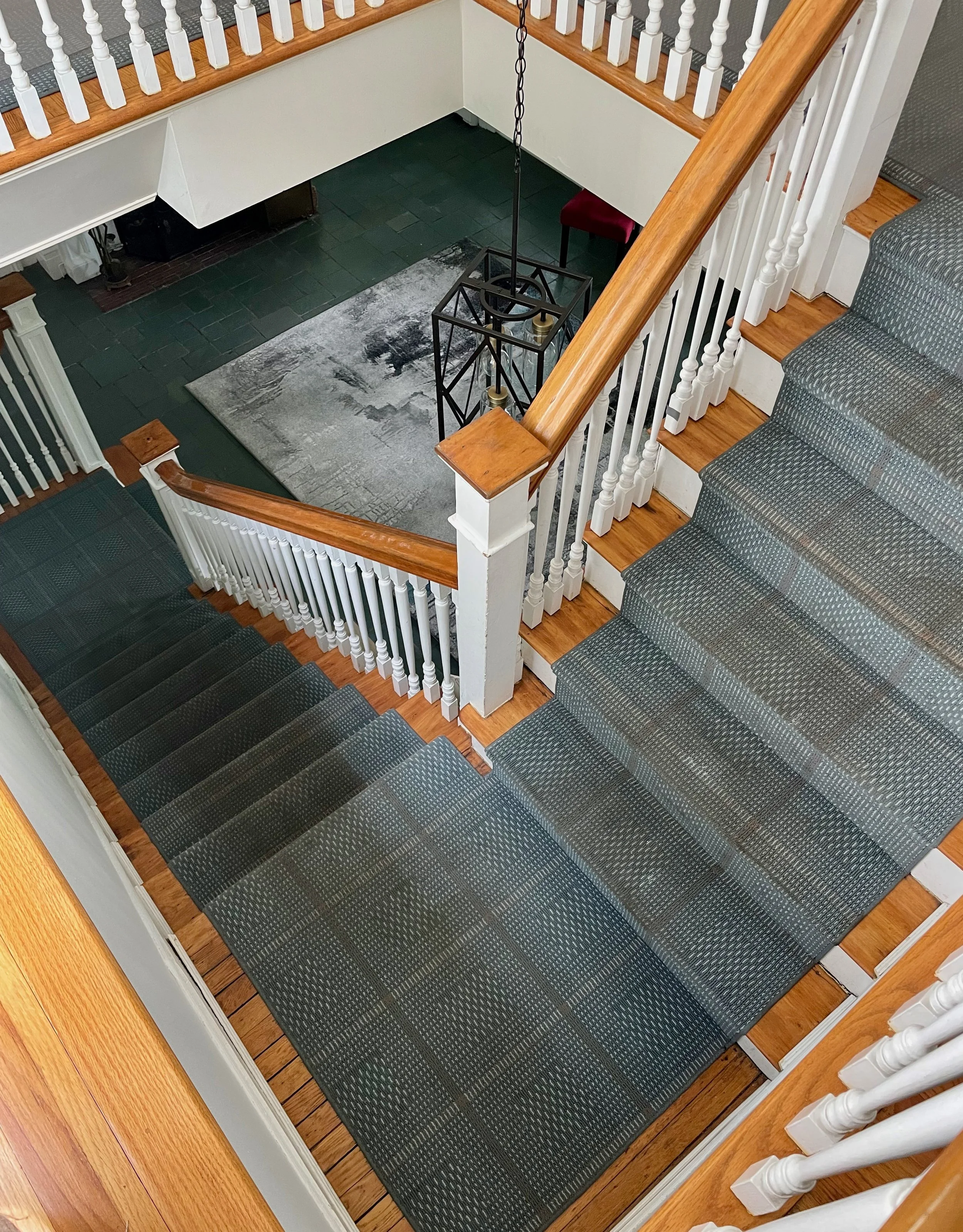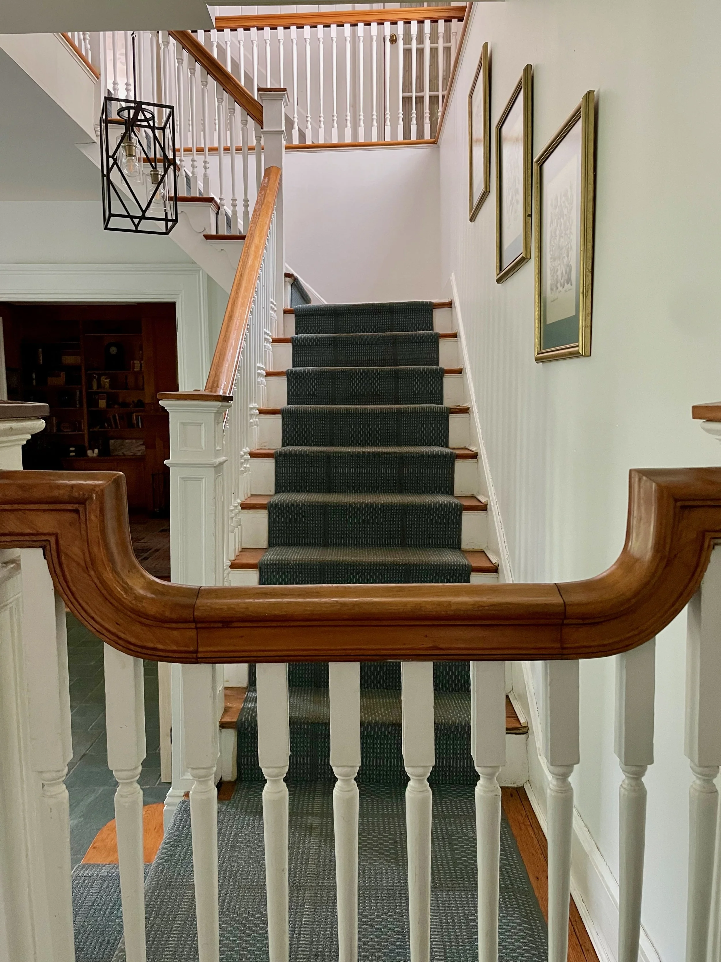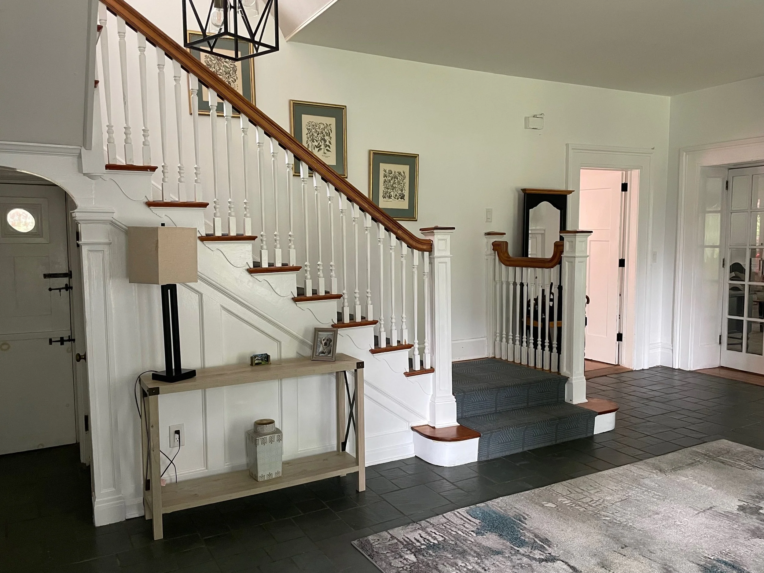 The main stairway in the entrance hall has two landings. A railing surrounds the stairway in the upstairs hall, which also gives a view to the entrance below. A second stairway is located in the rear of the house, by the back door entry. There are three steps leading up into the library and master bedroom area, and a narrow flight of stairs leading down the home economist kitchen.
